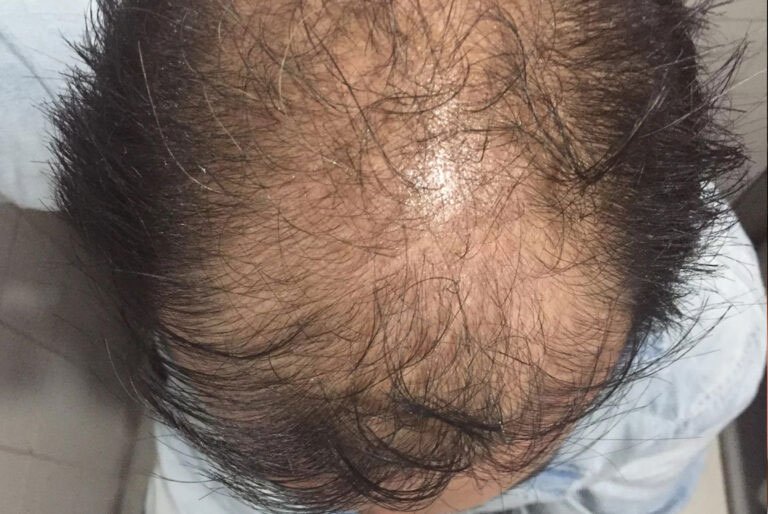 Comienza a desaparece a franja de cabello que separa las zonas de la coronilla y frontotemporal. Ahora parece una calvicie generalizada pero en realidad está profundamente localizada en ambas zonas. Es una calvicie bien avanzada y los tratamientos-no quirúrgicos- pocas veces ayudan.